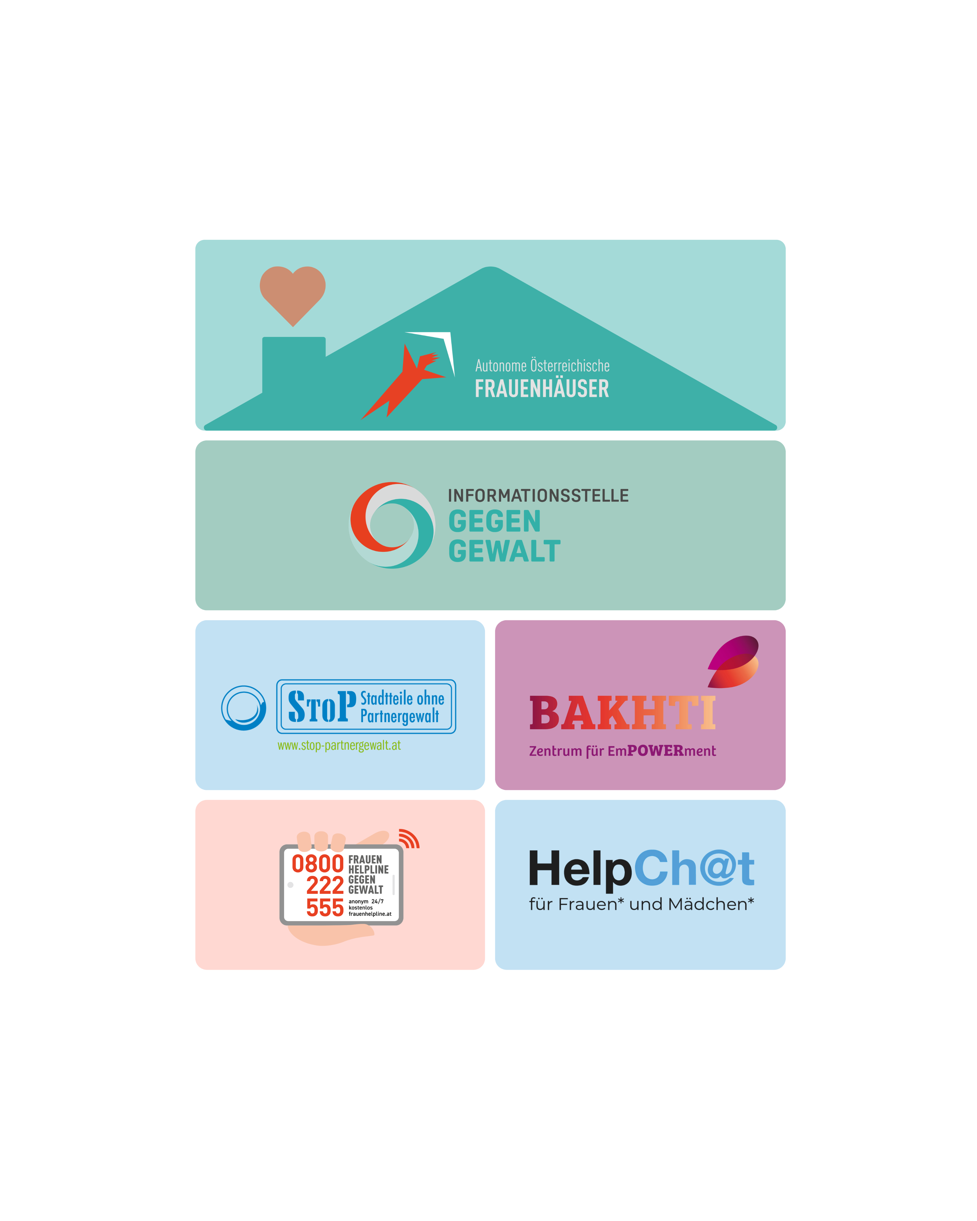 - Oberösterreich: Frauenhaus Braunau, Frauenhaus Linz, Frauenhaus Innviertel, Frauenhaus Steyr, Frauenhaus Vöcklabruck, Frauenhaus Wels