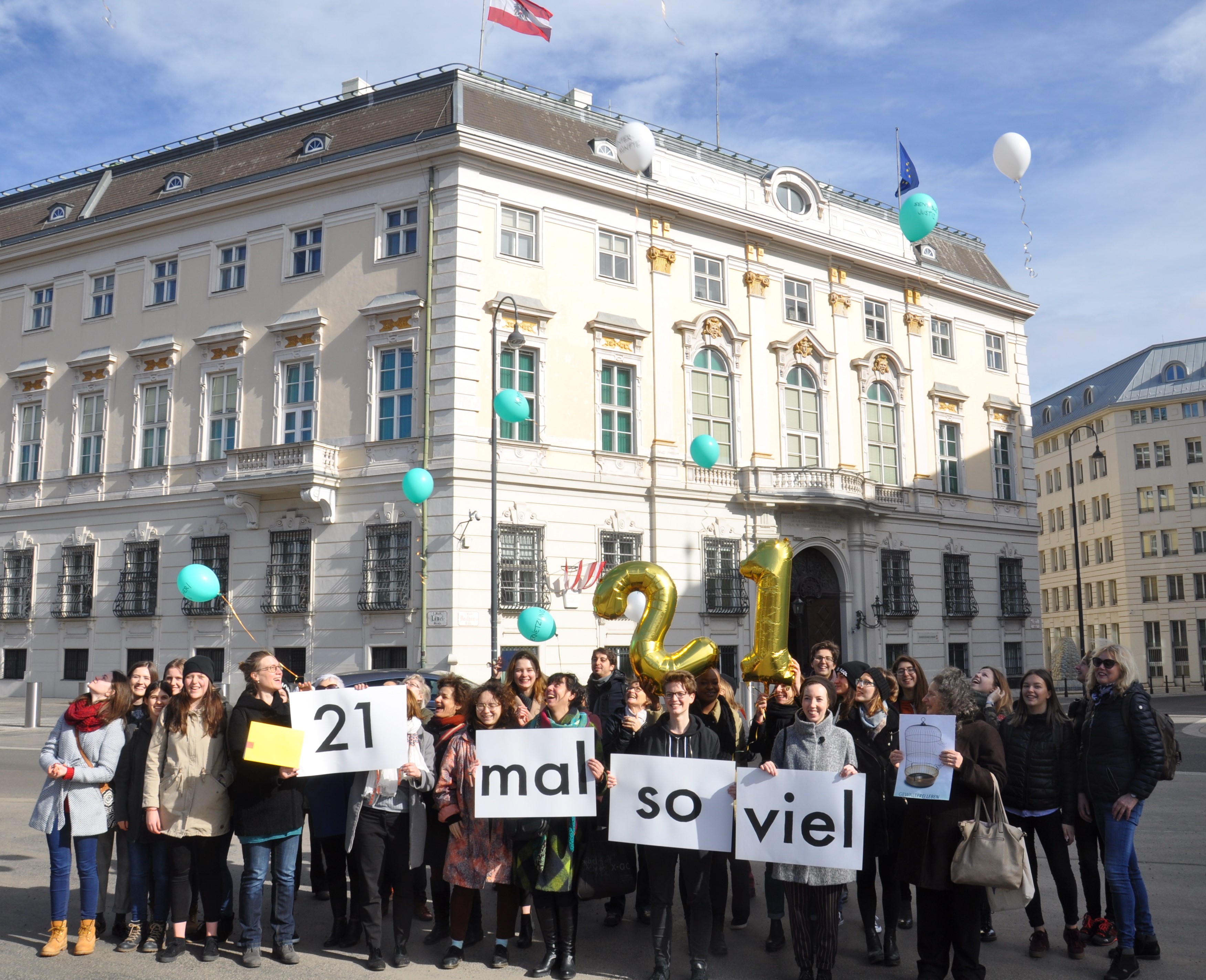 Vor der Budgetrede im Nationalrat ließ die Allianz "Gewaltfrei leben" 21 Luftballons vor dem Bundeskanzleramt in den Himmel steigen; jeder dieser Luftballons steht für 10 Millionen Euro. Darauf standen einige zentrale Maßnahmen zu Gewaltschutz und Gleichstellung, deren effektive Umsetzung nur durch eine Budgeterhöhung möglich ist. "Wenn wir Gewalt gegen Frauen und Mädchen beenden wollen, müssen wir in Schulungen, Workshops und Infomaterialien investieren und die Beratungsangebote und Notunterkünfte ausbauen", so Rosa Logar, eine Vertreterin der Allianz. Gleichstellungspolitik braucht außerdem eine breitere Erhebung spezifischer Daten und die Möglichkeit zur (inter)nationalen Vernetzung.