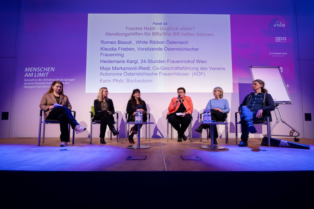 Als Teilnehmerin der Podiumsdiskussion Thema „Trautes Heim – Unglück allein?“ sprach AÖF-Geschäftsführerin Maja Markanović-Riedl über mögliche Anzeichen, wie Außenstehende erkennen können, dass eine Frau von häuslicher Gewalt betroffen ist, was Arbeitskolleg*innen bzw. Betriebsrät*innen tun können, wenn es Anzeichen gibt, dass eine Mitarbeiterin von Gewalt betroffen ist und welche gesellschaftlichen Veränderungen es in Österreich braucht, um die Gewalt an Frauen zu bekämpfen. Mit am Podium waren u.a. Autorin Karin Pfolz, Klaudia Frieben, Vorsitzende des Österreichischen Frauenrings sowie Psychotherapeut und Männerberater Romeo Bissuti.