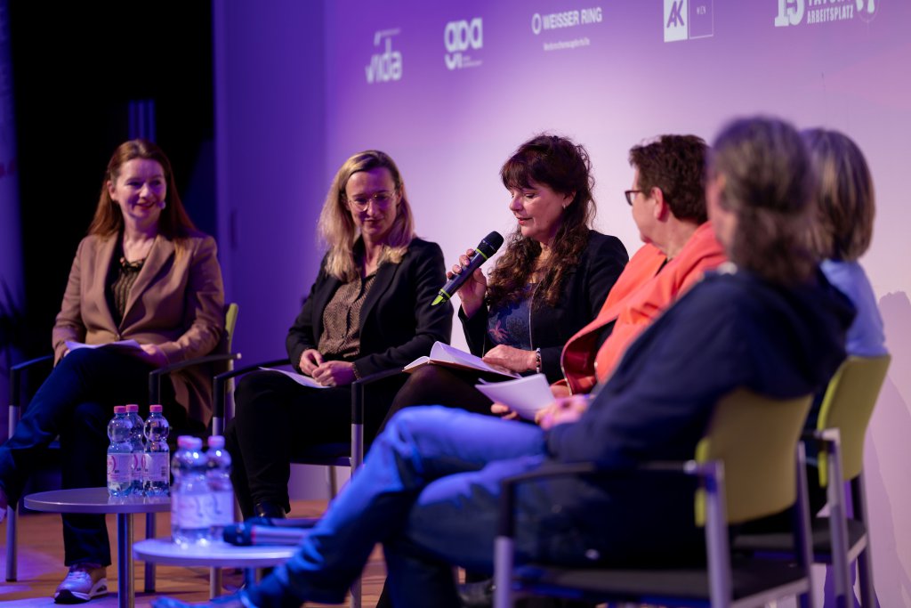 AÖF-Co-Geschäftsführerin Maja Markanović-Riedl (2.v.l.) am Podium bei "Tatort Arbeitsplatz" am 13.3.2024. Foto-Credit: Armin Fuchs